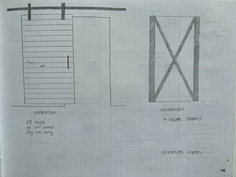 Toen wij terug waren in Nederland konden we weer een huis kopen in Hilversum. De badkamerdeur was een hele oude harmonicadeur, die ik niet zo charmant vond. Daar zocht ik wat anders voor. Toen ik in het boshuisje van mijn opa en oma was, ging ik naar de houtopslag van mijn opa. Hij had nog allemaal latjes over, waardoor ik op het idee kwam van die latjes een schuifdeur te maken. Op sommige latjes staan nog aantekeningen van mijn opa. Het gele latje is een van de latjes waar het oorspronkelijke boshuisje van is gemaakt. Daarom heeft deze deur ook nog eens een extra betekenis voor mij.
